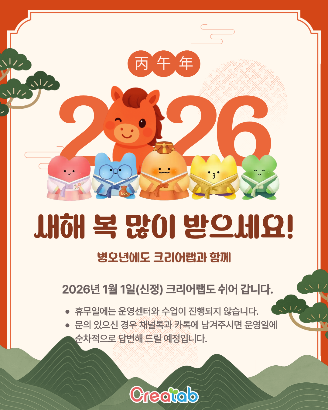 • 25.12.25(목), 26.01.01(목) : 성탄절(12/25)과 신정(1/1)은 크리어랩도 쉬어 갑니다.